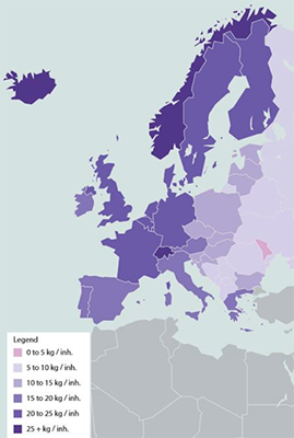 Norway generates 28.3 kilograms per inhabitant, Switzerland 26.3 kg and Iceland